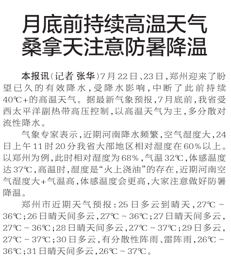 7月22日、23日,郑州迎来了盼望已久的有效降水,受降水影响,中断了此前持续40℃+的高温天气。据最新气象预报,7月底前,我省受西太平洋副热带高压控制,以高温天气为主,多分散对流性降水。(今日《郑州日报》2版)