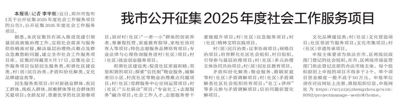 近日,郑州市发布《关于公开征集2025年度社会工作服务项目的公告》,公开征集2025年度社会工作服务项目。(今日《郑州日报》2版)