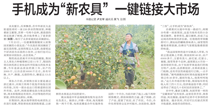 炎炎夏日,瓜果飘香,在中牟新区大孟街道张湾村一座230多亩的梨园里,种植着新玉蜜梨、苏翠一号两个品种,黄澄澄的果实挂满了树枝,给丰收季奉上了更多甜蜜,吸引了众多家庭到此采摘游玩。(今日《郑州日报》7版)