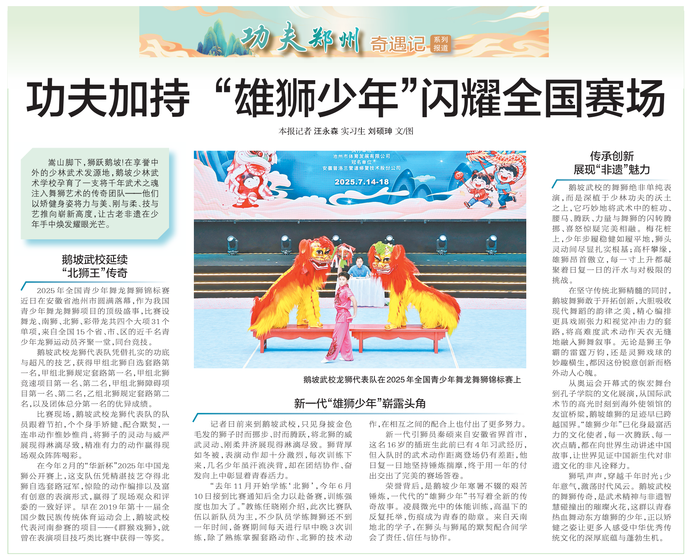 嵩山脚下,狮跃鹅坡!在享誉中外的少林武术发源地,鹅坡少林武术学校孕育了一支将千年武术之魂注入舞狮艺术的传奇团队——他们以矫健身姿将力与美、刚与柔、技与艺推向崭新高度,让古老非遗在少年手中焕发耀眼光芒。(今日《郑州日报》8版)
