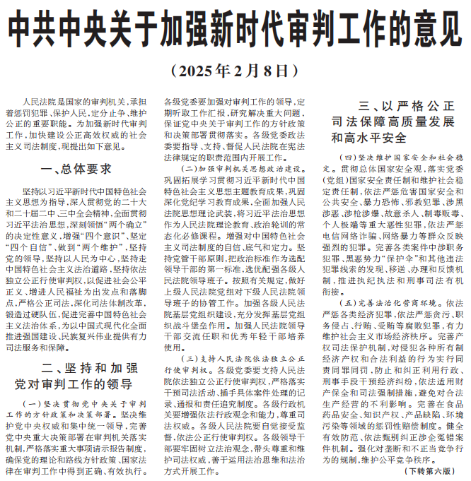 人民法院是国家的审判机关,承担着惩罚犯罪、保护人民,定分止争、维护公正的重要职能。为加强新时代审判工作,加快建设公正高效权威的社会主义司法制度,现提出如下意见。(今日《人民日报》1版、6版)