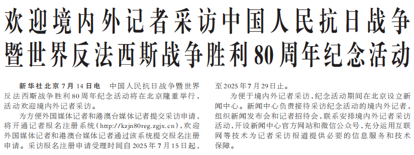 中国人民抗日战争暨世界反法西斯战争胜利80周年纪念活动将在北京隆重举行,活动欢迎境内外记者采访。(今日《人民日报》1版)