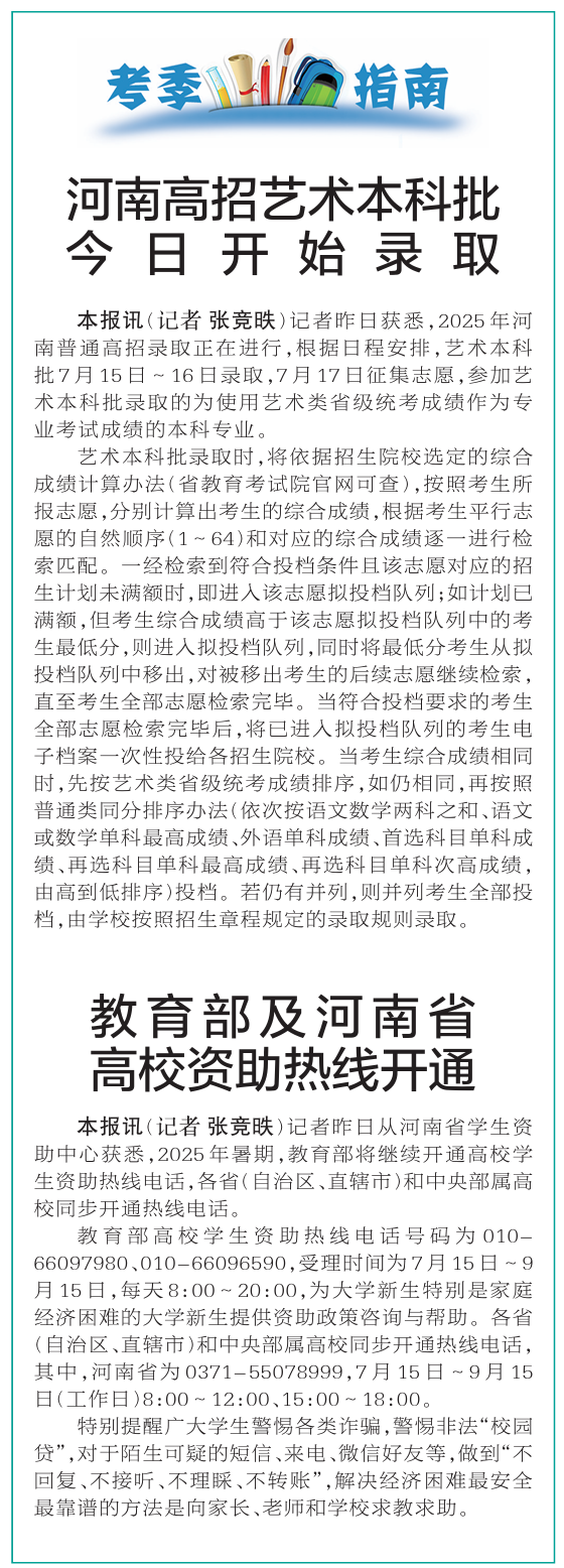 记者昨日获悉,2025年河南普通高招录取正在进行,根据日程安排,艺术本科批7月15日~16日录取,7月17日征集志愿,参加艺术本科批录取的为使用艺术类省级统考成绩作为专业考试成绩的本科专业。(今日《郑州日报》1版)