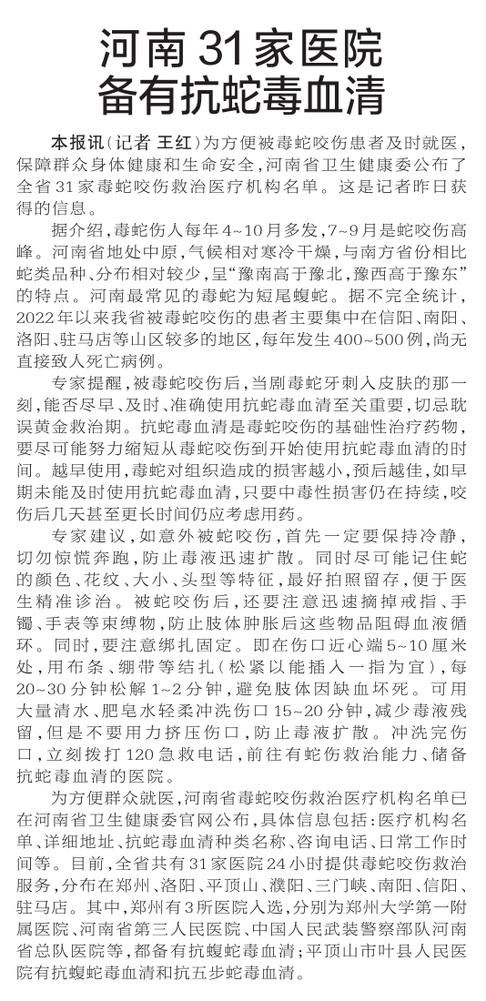 为方便被毒蛇咬伤患者及时就医,保障群众身体健康和生命安全,河南省卫生健康委公布了全省31家毒蛇咬伤救治医疗机构名单。这是记者昨日获得的信息。(今日《郑州日报》2版)