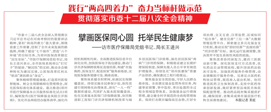 “市委十二届八次全会深入贯彻落实习近平总书记在河南考察时的重要讲话精神,紧扣‘两高四着力’重大要求,围绕省委工作部署,绘制了全市未来发展的路线图,明确了建设‘七个强市’、营造‘六个环境’的目标任务,为郑州医保改革锚定‘民生坐标’。”市医疗保障局党组书记、局长王进兴表示,全市医保系统将以“钉钉子”的韧劲、“解民忧”的实招,推动全会精神转化为惠民实效,让医保改革红利从“纸面”落到群众“身边”。(今日《郑州日报》2版)
