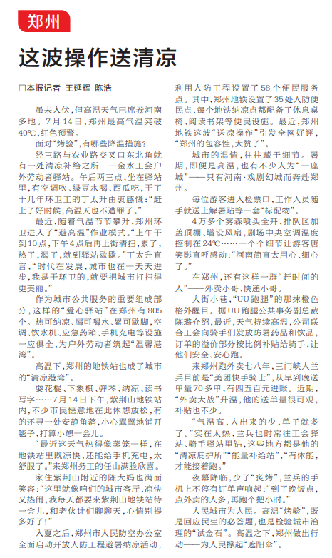 为应对近日高温“烤”验,郑州城管部门积极行动,提前安排部署,从洒水降温、驿站使用、用水保供等多方面入手,全方位保障城市正常运转。(今日《郑州日报》1版)