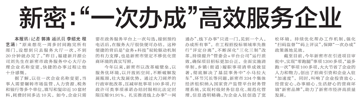 “原来想花一周多时间跑完所有部门,没想到只去服务大厅一次,不到20分钟就办完了。”昨日,福建新开源公司刘先生在新密市政务服务中心大厅办理企业名称变更,快捷的办事过程让他十分感慨。