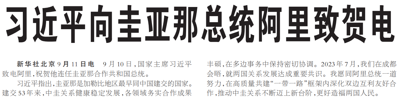 9月10日,国家主席习近平致电阿里,祝贺他连任圭亚那合作共和国总统。(今日《人民日报》1版)