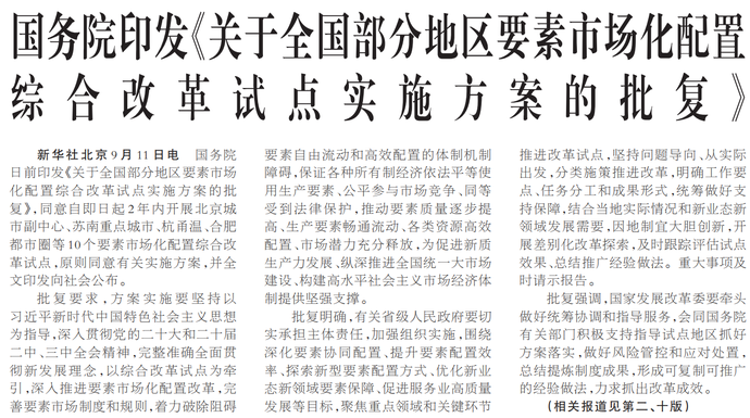 国务院日前印发《关于全国部分地区要素市场化配置综合改革试点实施方案的批复》,同意自即日起2年内开展北京城市副中心、苏南重点城市、杭甬温、合肥都市圈等10个要素市场化配置综合改革试点,原则同意有关实施方案,并全文印发向社会公布。(今日《人民日报》1版、2版、10版)