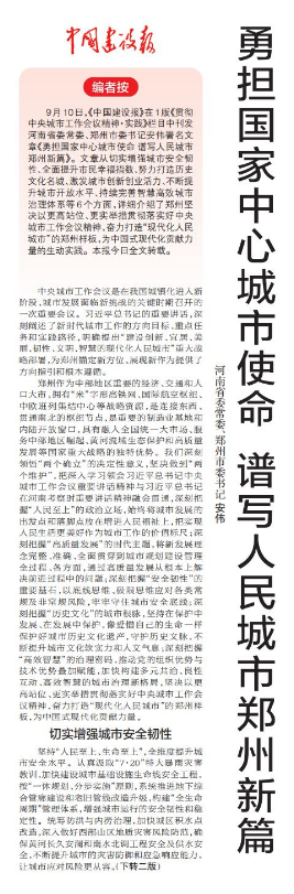 9月10日,《中国建设报》在1版《贯彻中央城市工作会议精神·实践》栏目中刊发河南省委常委、郑州市委书记安伟署名文章《勇担国家中心城市使命 谱写人民城市郑州新篇》。文章从切实增强城市安全韧性、全面提升市民幸福指数、努力打造历史文化名城、激发城市创新创业活力、不断提升城市开放水平、持续完善智慧高效城市治理体系等6个方面,详细介绍了郑州坚决以更高站位、更实举措贯彻落实好中央城市工作会议精神,奋力打造“现代化人民城市”的郑州样板,为中国式现代化贡献力量的生动实践。本报今日全文转载。