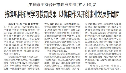 9月11日,市长、市政府党组书记庄建球主持召开市政府党组(扩大)会议,传达学习习近平总书记关于深入贯彻中央八项规定精神学习教育的重要指示,全面落实中央及省、市党的建设工作领导小组会议部署,总结市政府党组学习教育工作,锲而不舍落实中央八项规定精神,推动作风建设常态化长效化。(今日《郑州日报》1版)