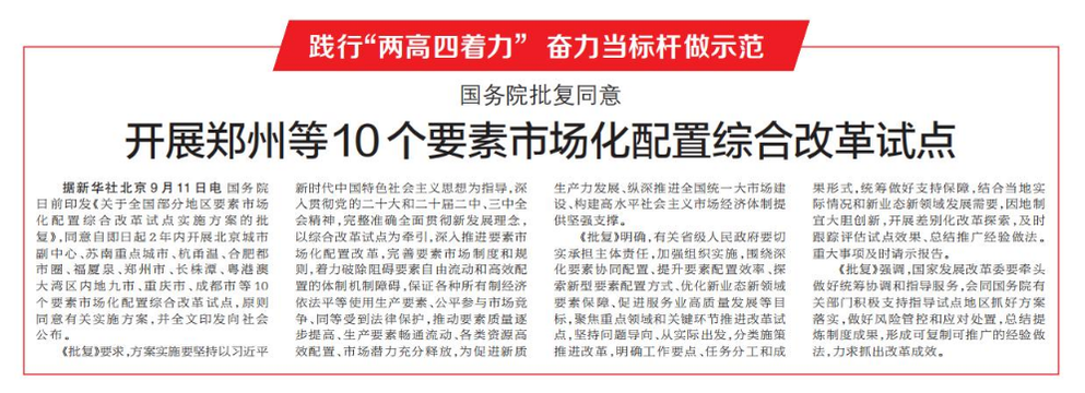 郑州又迎来重大发展机遇。9月11日,国务院批复,同意自即日起2年内开展北京城市副中心、苏南重点城市、杭甬温、合肥都市圈、福厦泉、郑州市、长株潭、粤港澳大湾区内地九市、重庆市、成都市等10个要素市场化配置综合改革试点。