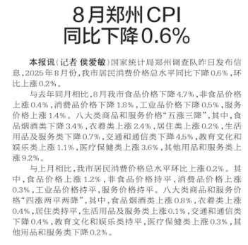 国家统计局郑州调查队昨日发布信息,2025年8月份,我市居民消费价格总水平同比下降0.6%,环比上涨0.2%。(今日《郑州日报》2版)