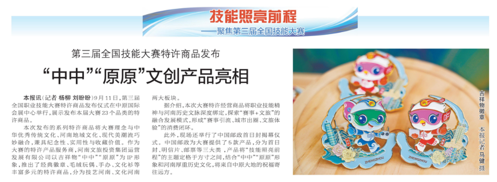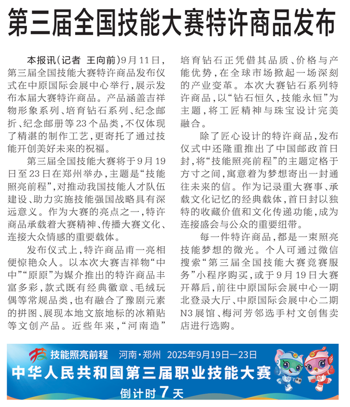 9月11日,第三届全国职业技能大赛特许商品发布仪式在中原国际会展中心举行,展示发布本届大赛23个品类的特许商品。(今日《郑州日报》2版)