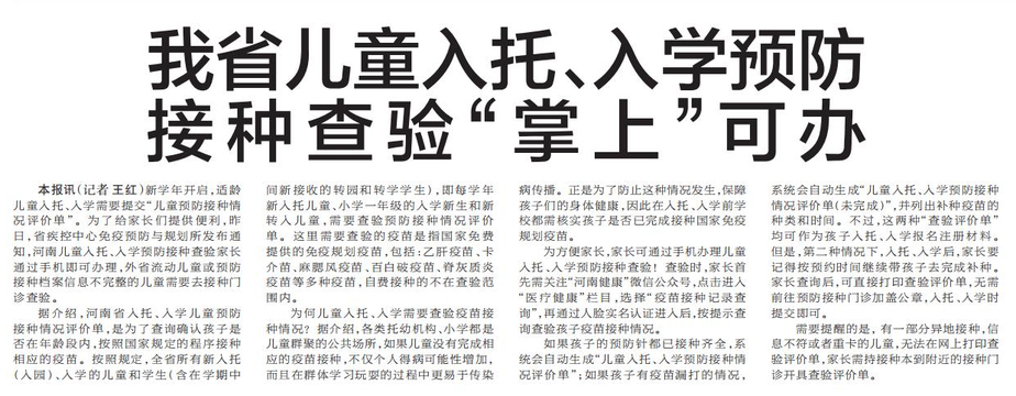 新学年开启,适龄儿童入托、入学需要提交“儿童预防接种情况评价单”。为了给家长们提供便利,昨日,省疾控中心免疫预防与规划所发布通知,河南儿童入托、入学预防接种查验家长通过手机即可办理,外省流动儿童或预防接种档案信息不完整的儿童需要去接种门诊查验。(今日《郑州日报》5版)