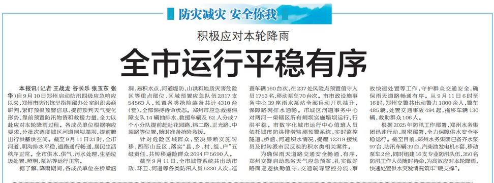 自9月10日郑州启动防汛四级应急响应以来,郑州市防汛抗旱指挥部办公室组织会商研判,紧盯预报预警信息、提前预判天气变化形势、靠前预置防汛物资和救援力量,全力以赴应对本轮降雨过程。各成员单位根据响应要求,分批次调度城区河道闸坝塌坝,提前腾出行洪蓄洪空间。截至9月11日21时,全市河道、明沟排水平稳,道路通行畅通,居民生活秩序正常。全市供水、供气、污水处理、生活垃圾处置、照明、泵站等运行正常。(今日《郑州日报》7版)