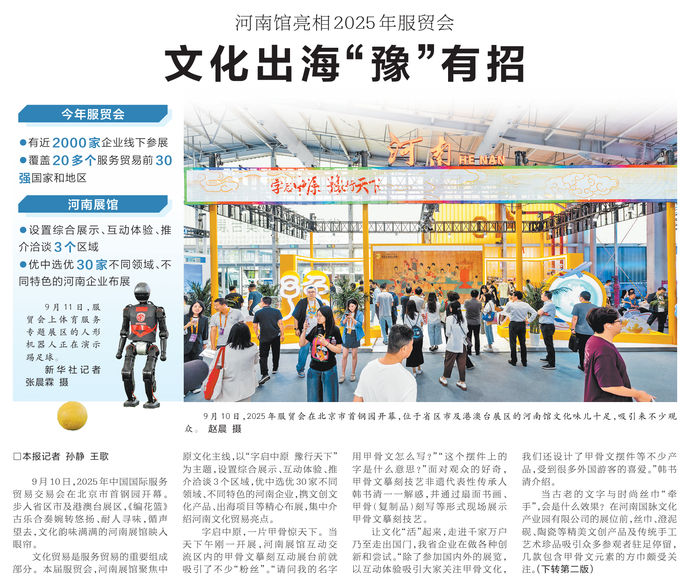 9月10日,2025年中国国际服务贸易交易会在北京市首钢园开幕。步入省区市及港澳台展区,《编花篮》古乐合奏婉转悠扬、耐人寻味,循声望去,文化韵味满满的河南展馆映入眼帘。(今日《河南日报》1版、2版)