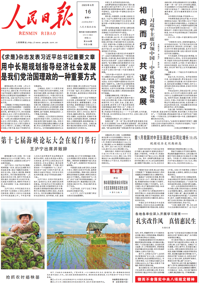 6月16日出版的第12期《求是》杂志将发表中共中央总书记、国家主席、中央军委主席习近平的重要文章《用中长期规划指导经济社会发展是我们党治国理政的一种重要方式》。这是习近平总书记2015年10月至2025年4月期间有关重要论述的节录。(今日《人民日报》1版)