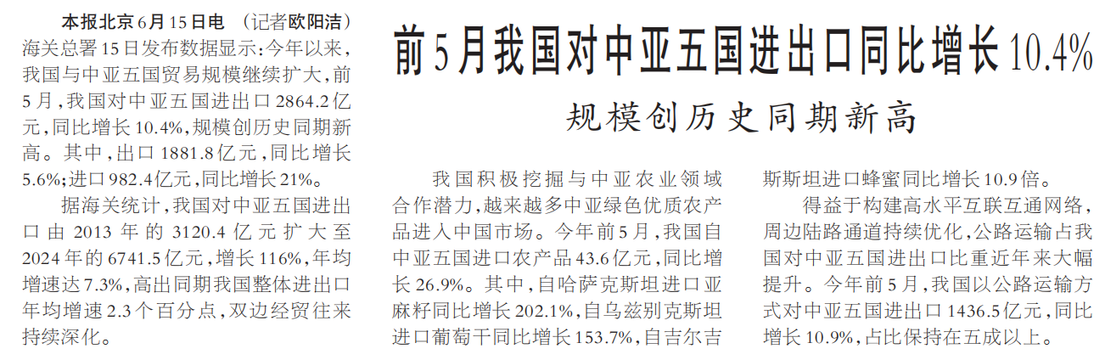 海关总署15日发布数据显示:今年以来,我国与中亚五国贸易规模继续扩大,前5月,我国对中亚五国进出口2864.2亿元,同比增长10.4%,规模创历史同期新高。其中,出口1881.8亿元,同比增长5.6%;进口982.4亿元,同比增长21%。(今日《人民日报》1版)