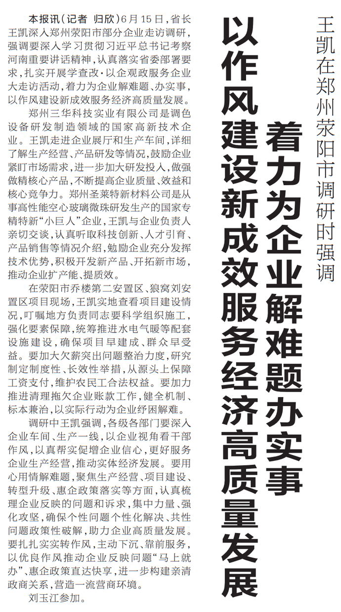 6月15日,省长王凯深入郑州荥阳市部分企业走访调研,强调要深入学习贯彻习近平总书记考察河南重要讲话精神,认真落实省委部署要求,扎实开展学查改·以企观政服务企业大走访活动,着力为企业解难题、办实事,以作风建设新成效服务经济高质量发展。(今日《河南日报》1版)