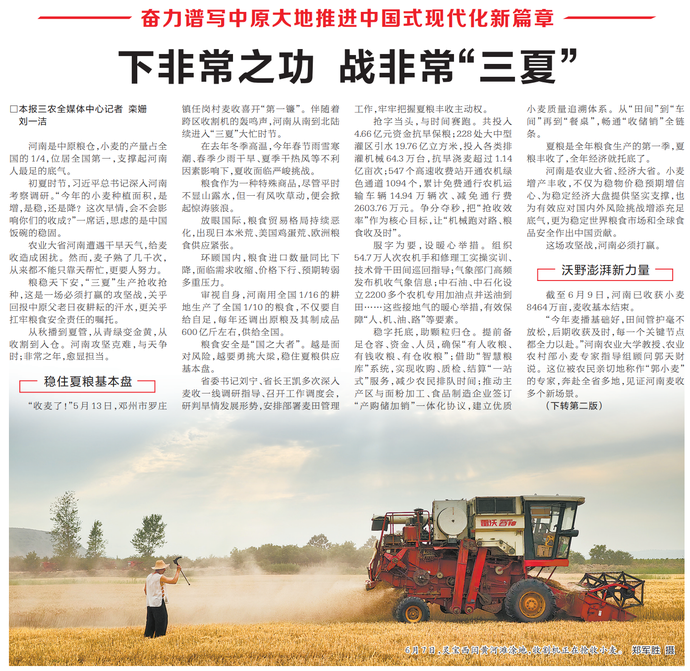 河南是中原粮仓,小麦的产量占全国的1/4,位居全国第一,支撑起河南人最足的底气。(今日《河南日报》1版、2版)