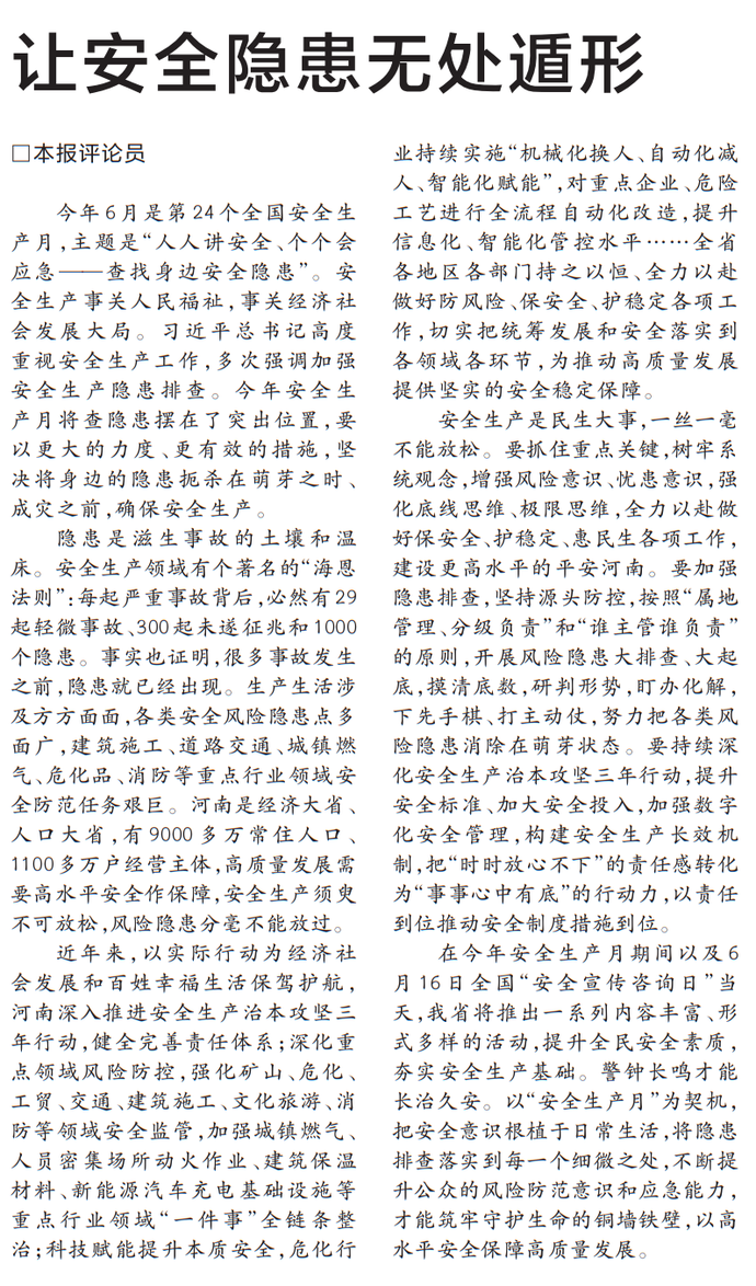 今年6月是第24个全国安全生产月,主题是“人人讲安全、个个会应急——查找身边安全隐患”。安全生产事关人民福祉,事关经济社会发展大局。习近平总书记高度重视安全生产工作,多次强调加强安全生产隐患排查。今年安全生产月将查隐患摆在了突出位置,要以更大的力度、更有效的措施,坚决将身边的隐患扼杀在萌芽之时、成灾之前,确保安全生产。(今日《河南日报》1版)