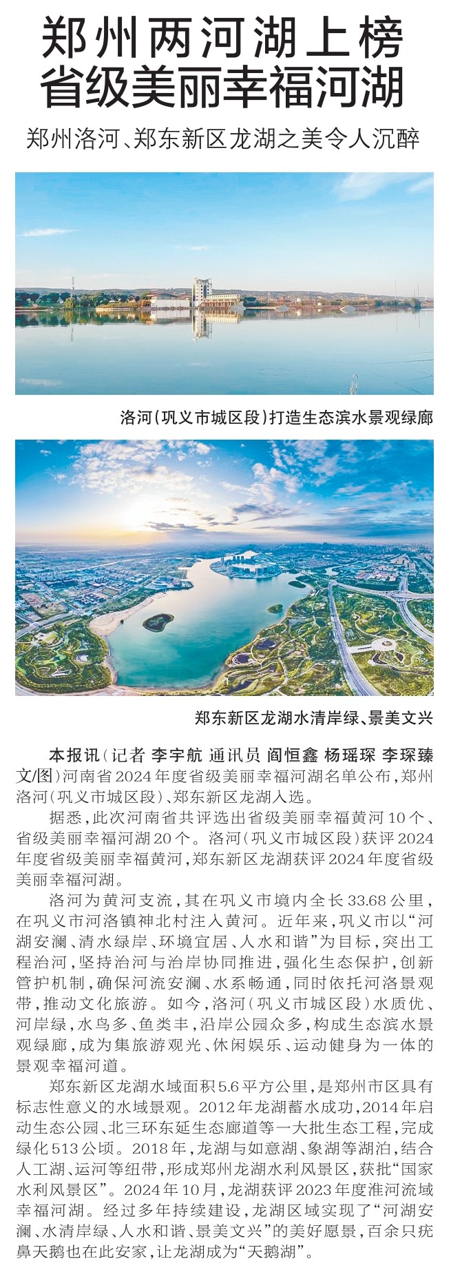 河南省2024年度省级美丽幸福河湖名单公布,郑州洛河(巩义市城区段)、郑东新区龙湖入选。(今日《郑州日报》1版)