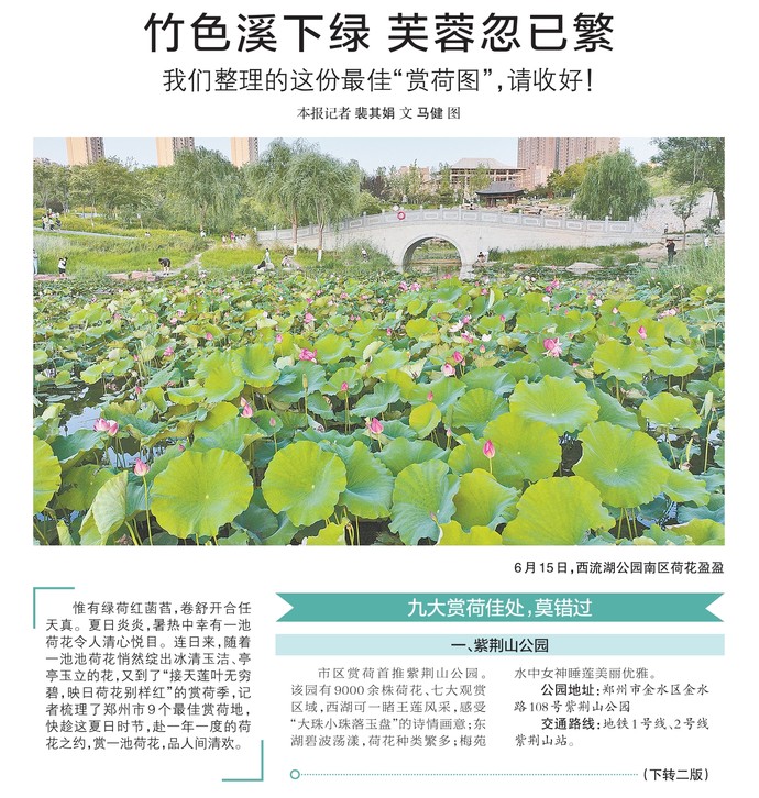 惟有绿荷红菡萏,卷舒开合任天真。夏日炎炎,暑热中幸有一池荷花令人清心悦目。连日来,随着一池池荷花悄然绽出冰清玉洁、亭亭玉立的花,又到了“接天莲叶无穷碧,映日荷花别样红”的赏荷季,记者梳理了郑州市9个最佳赏荷地,快趁这夏日时节,赴一年一度的荷花之约,赏一池荷花,品人间清欢。(今日《郑州日报》1版、2版)