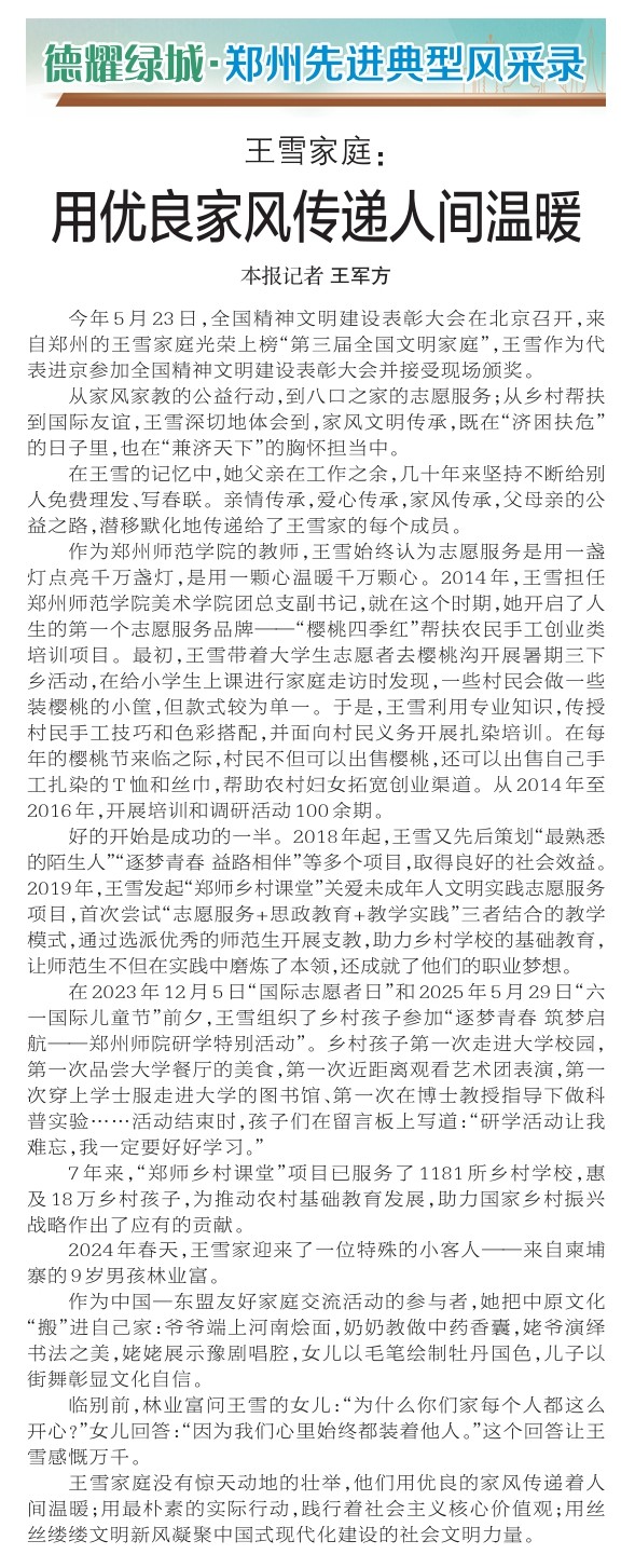 今年5月23日,全国精神文明建设表彰大会在北京召开,来自郑州的王雪家庭光荣上榜“第三届全国文明家庭”,王雪作为代表进京参加全国精神文明建设表彰大会并接受现场颁奖。(今日《郑州日报》2版)