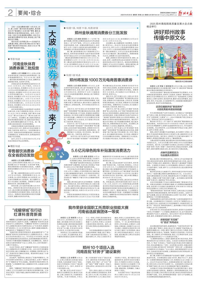 又有一大波消费券来袭!9月25日、26日,第二批第一期河南体育消费券,第四期2025年“缤纷夏日·乐享河南”零售、餐饮消费券将在全省范围启动发放。此外,10月1日起,1000万元电商普惠消费券、2000万元金秋通用消费券同步发放,推动线上线下购物狂欢不停歇。(今日《郑州日报》2版)