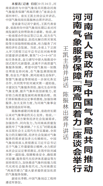 9月24日,河南省政府与中国气象局共同推动河南气象服务保障“两高四着力”座谈会在郑州举行。省长王凯主持会议并讲话,中国气象局局长陈振林出席并讲话。(今日《河南日报》1版)
