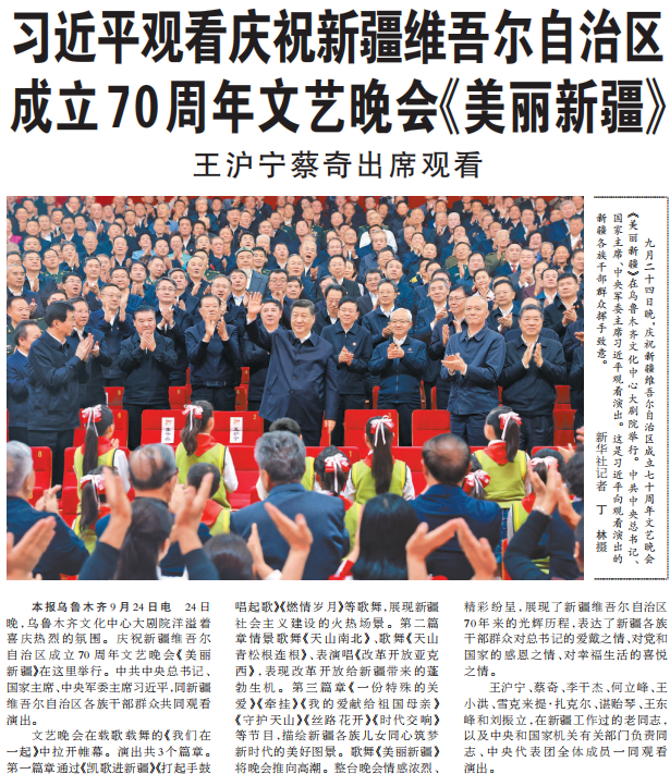 24日晚,乌鲁木齐文化中心大剧院洋溢着喜庆热烈的氛围。庆祝新疆维吾尔自治区成立70周年文艺晚会《美丽新疆》在这里举行。中共中央总书记、国家主席、中央军委主席习近平,同新疆维吾尔自治区各族干部群众共同观看演出。(今日《人民日报》1版)