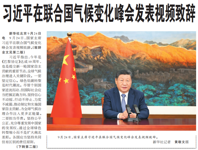 9月24日,国家主席习近平在联合国气候变化峰会发表视频致辞。(今日《人民日报》1版、2版)