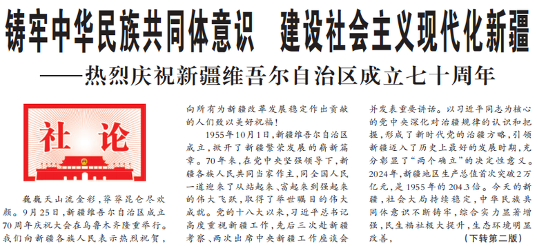 巍巍天山流金彩,莽莽昆仑尽欢颜。9月25日,新疆维吾尔自治区成立70周年庆祝大会在乌鲁木齐隆重举行。我们向新疆各族人民表示热烈祝贺,向所有为新疆改革发展稳定作出贡献的人们致以美好祝福!(今日《人民日报》1版、2版)