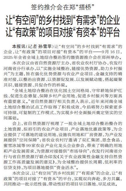 让“有空间”的乡村找到“有需求”的企业,让“有政策”的项目对接“有资本”的平台——9月16日,2025年全省全域土地综合整治签约暨资源推介会在郑州举办。(今日《郑州日报》1版)