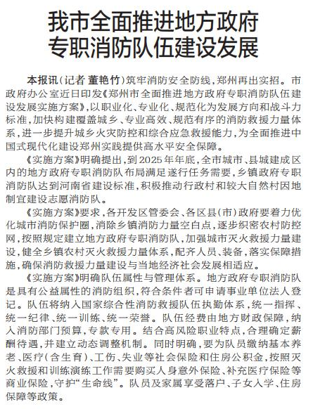 筑牢消防安全防线,郑州再出实招。市政府办公室近日印发《郑州市全面推进地方政府专职消防队伍建设发展实施方案》,以职业化、专业化、规范化为发展方向和战斗力标准,加快构建覆盖城乡、专业高效、规范有序的消防救援力量体系,进一步提升城乡火灾防控和综合应急救援能力,为全面推进中国式现代化建设郑州实践提供高水平安全保障。(今日《郑州日报》1版)