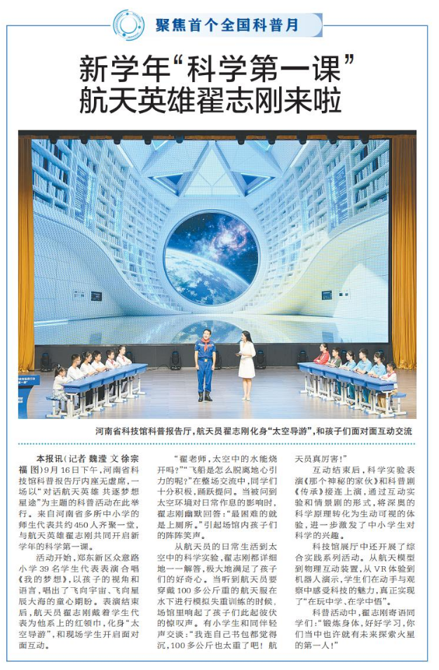9月16日下午,河南省科技馆科普报告厅内座无虚席,一场以“对话航天英雄 共逐梦想星途”为主题的科普活动在此举行。来自河南省多所中小学的师生代表共约450人齐聚一堂,与航天英雄翟志刚共同开启新学年的科学第一课。(今日《郑州日报》1版)
