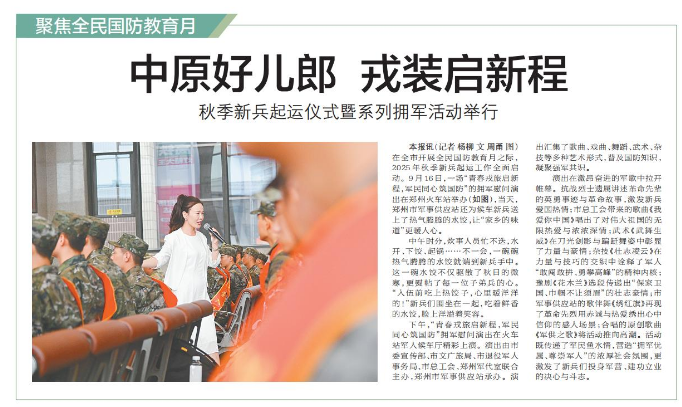 在全市开展全民国防教育月之际,2025年秋季新兵起运工作全面启动。9月16日,一场“青春戎旅启新程,军民同心筑国防”的拥军慰问演出在郑州火车站举办,当天,郑州市军事供应站还为候车新兵送上了热气腾腾的水饺,让“家乡的味道”更暖人心。(今日《郑州日报》2版)