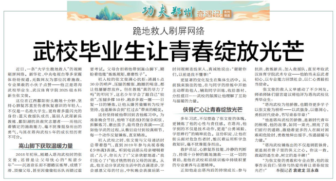 近日,一条“大学生跪地救人”的视频刷屏网络。新华社、中央电视台等多家媒体纷纷报道,无数网友为那位沉着施救、专业果敢的小伙子点赞——他正是塔沟武校毕业生、武汉体育学院2025级本科新生张文俊。(今日《郑州日报》5版)