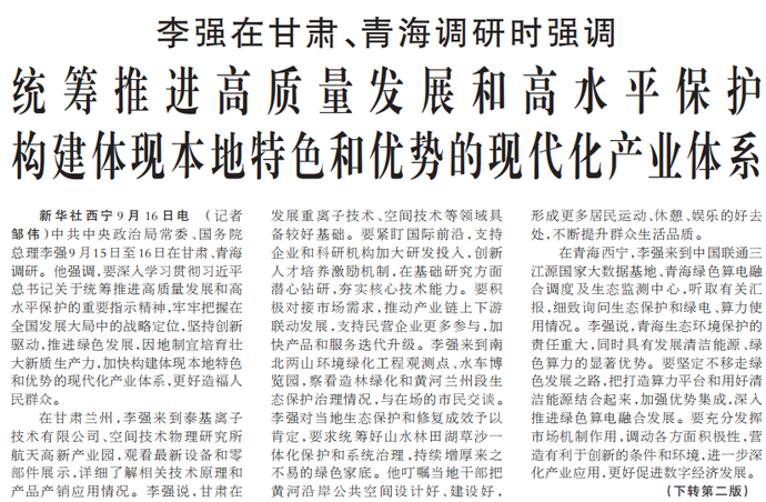 中共中央政治局常委、国务院总理李强9月15日至16日在甘肃、青海调研。他强调,要深入学习贯彻习近平总书记关于统筹推进高质量发展和高水平保护的重要指示精神,牢牢把握在全国发展大局中的战略定位,坚持创新驱动,推进绿色发展,因地制宜培育壮大新质生产力,加快构建体现本地特色和优势的现代化产业体系,更好造福人民群众。(今日《人民日报》1版、2版)