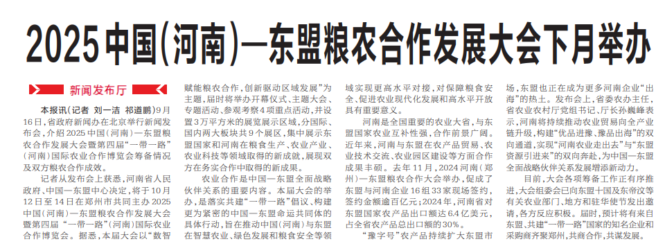 9月16日,省政府新闻办在北京举行新闻发布会,介绍2025中国(河南)—东盟粮农合作发展大会暨第四届“一带一路”(河南)国际农业合作博览会筹备情况及双方粮农合作成效。(今日《河南日报》4版)