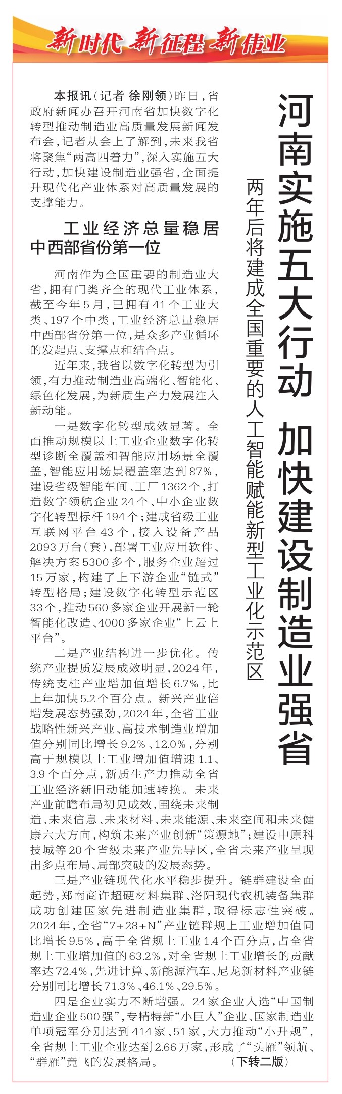 昨日,省政府新闻办召开河南省加快数字化转型推动制造业高质量发展新闻发布会,记者从会上了解到,未来我省将聚焦“两高四着力”,深入实施五大行动,加快建设制造业强省,全面提升现代化产业体系对高质量发展的支撑能力。(今日《郑州日报》1版、2版)