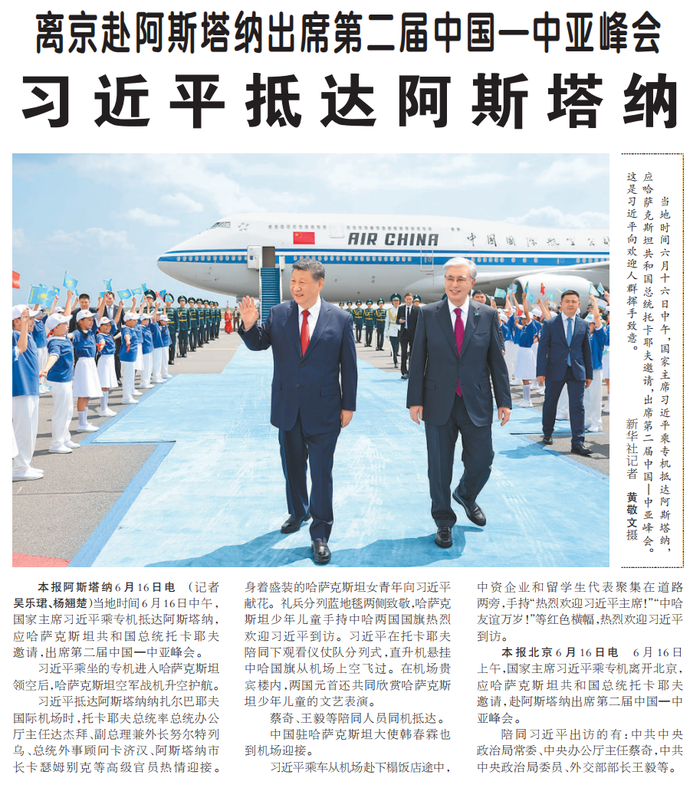当地时间6月16日中午,国家主席习近平乘专机抵达阿斯塔纳,应哈萨克斯坦共和国总统托卡耶夫邀请,出席第二届中国—中亚峰会。(今日《人民日报》1版)