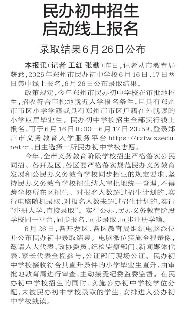 昨日,记者从市教育局获悉,2025年郑州市民办初中学校6月16日、17日两日集中线上报名,6月26日公布录取结果。(今日《郑州日报》1版)