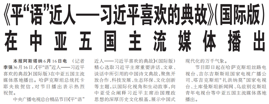 6月16日,《平“语”近人——习近平喜欢的典故》(国际版)在中亚五国主流媒体落地播出。哈萨克斯坦总统托卡耶夫致贺信,对节目播出表示热烈祝贺。(今日《人民日报》1版)
