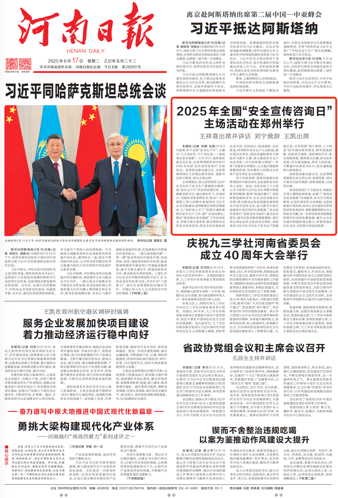 今年6月是第24个全国“安全生产月”,主题为“人人讲安全、个个会应急——查找身边安全隐患”。6月16日,国务院安委会办公室、应急管理部在郑州举行2025年全国“安全宣传咨询日”主场活动。国务院安委会副主任、应急管理部部长王祥喜出席并讲话,省委书记刘宁致辞,省长王凯出席。(今日《河南日报》1版)