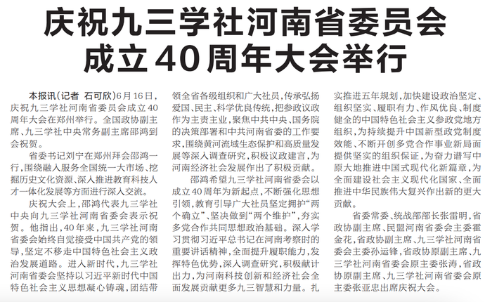6月16日,庆祝九三学社河南省委员会成立40周年大会在郑州举行。全国政协副主席、九三学社中央常务副主席邵鸿到会祝贺。(今日《河南日报》1版)