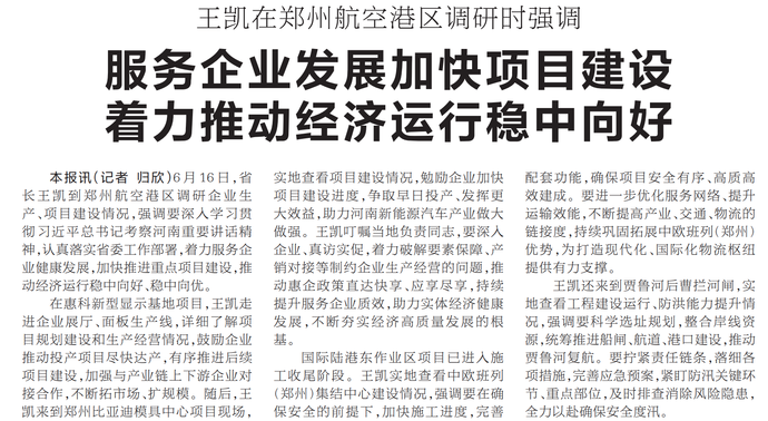 6月16日,省长王凯到郑州航空港区调研企业生产、项目建设情况,强调要深入学习贯彻习近平总书记考察河南重要讲话精神,认真落实省委工作部署,着力服务企业健康发展,加快推进重点项目建设,推动经济运行稳中向好、稳中向优。(今日《河南日报》1版)