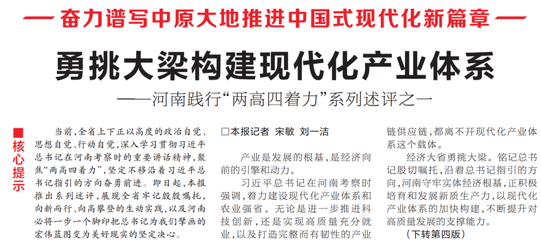习近平总书记在河南考察时强调,着力建设现代化产业体系和农业强省。无论是进一步推进科技创新,还是实现高质量充分就业,以及打造完整而有韧性的产业链供应链,都离不开现代化产业体系这个载体。(今日《河南日报》1版、4版)