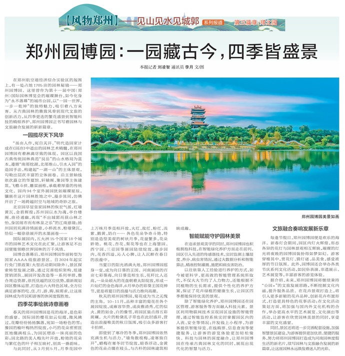 在郑州航空港经济综合实验区的版图上,有一处占地1785亩的园林秘境——郑州园博园。这里曾作为第十一届中国(郑州)国际园林博览会的璀璨舞台,如今化身为“永不落幕”的城市公园,以“一园一世界,一步一乾坤”的独特魅力,吸引着八方来客。从古典园林的雅致风骨到现代文旅的创新活力,从四季更迭的繁花盛景到智能科技的精细养护,郑州园博园正书写着园林与文旅融合发展的崭新篇章。(今日《郑州日报》2版)